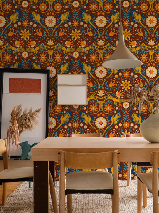 Folkie Birdie Wallpaper, rust, merigold & blue