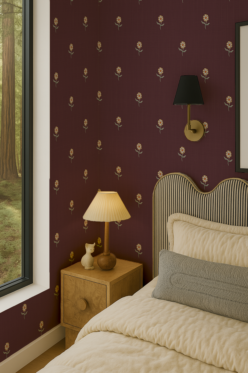 Perfect for bedrooms, nurseries, living rooms, powder rooms, and cottage-style interiors, Daisy Dots offers a refined floral look that feels warm, calming, and effortlessly layered. The small-scale repeat adds visual interest without overwhelming the space, making it ideal for both accent walls and full-room installations.