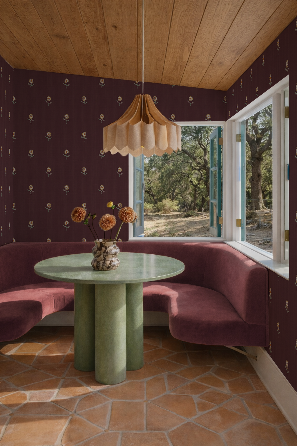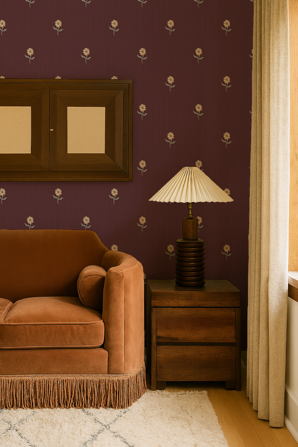 Available in a range of earthy colorways—including rich plum—this wallpaper pairs beautifully with wood furniture, natural textures, and both traditional and modern décor.