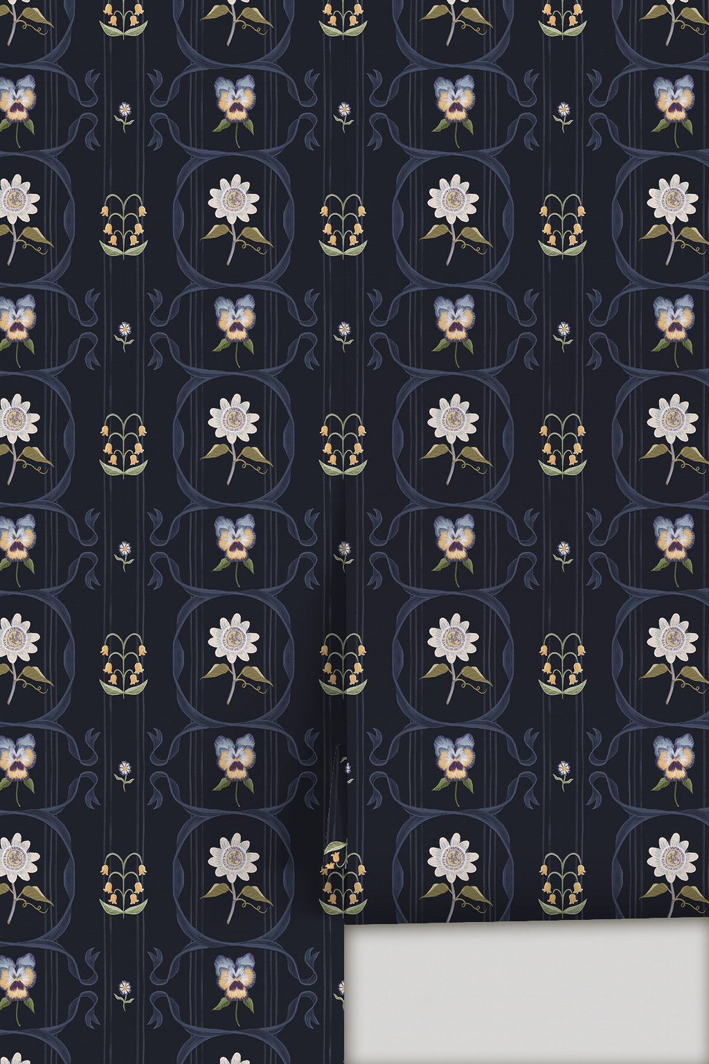 This heirloom-inspired pattern features illustrated pansies, passion fruit flowers, daisies, and buttercups arranged in an elegant trellis layout. Soft stripe and ribbon details add structure and movement, giving the wallpaper a refined, vintage feel that’s both classic and inviting.