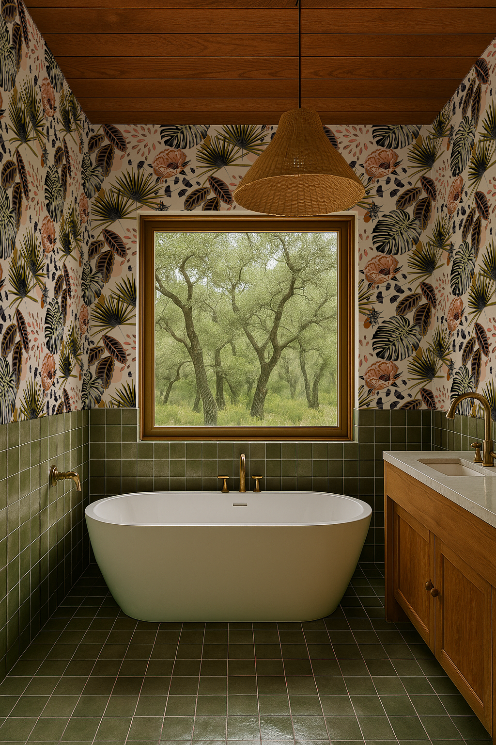 • Bold tropical floral wallpaper with a modern, artistic edge