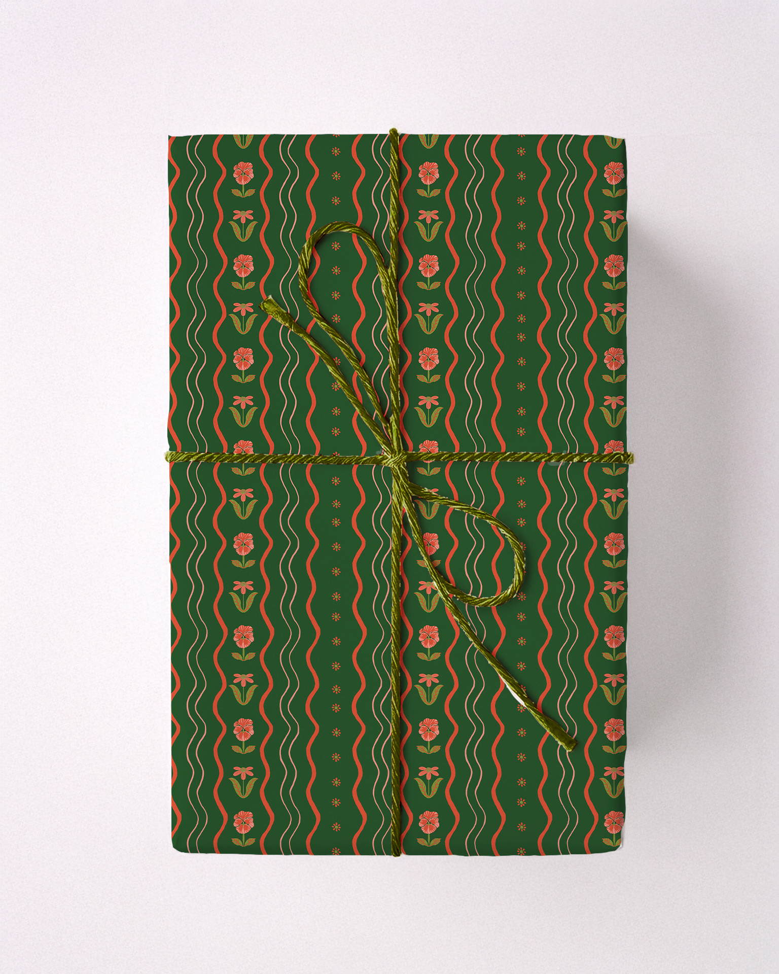 Celebrate the season with this festive Christmas gift wrap featuring Samantha Santana’s Posy Lane design—a playful mix of wavy stripes and floral motifs in rich holiday tones of green and poppy red. This modern yet nostalgic pattern brings a touch of charm and cheer to every package, making your gifts as beautiful on the outside as they are inside.