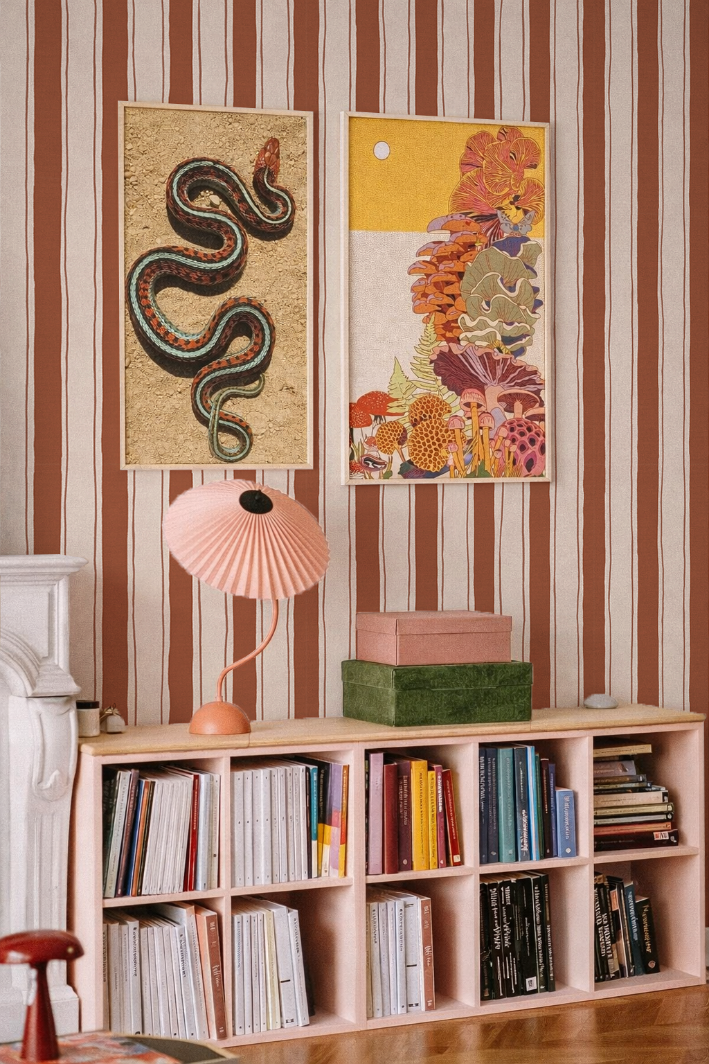 • Classic vertical stripe wallpaper with a modern, hand-drawn feel